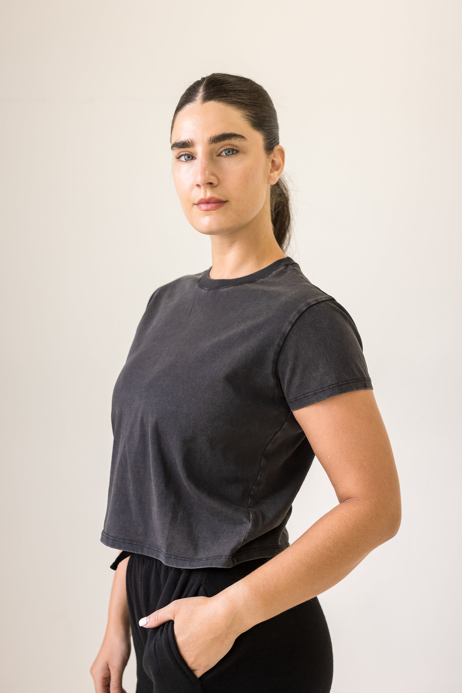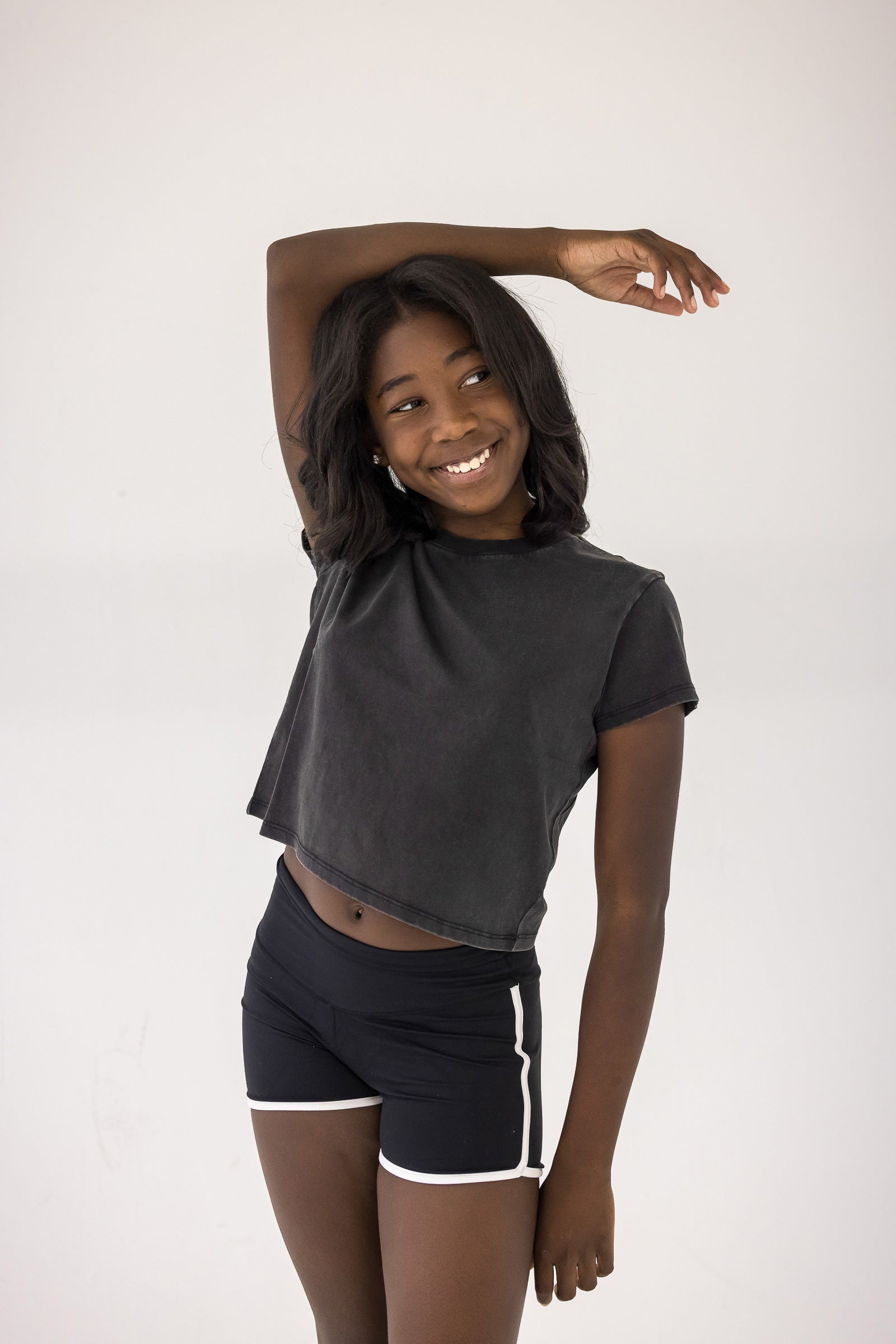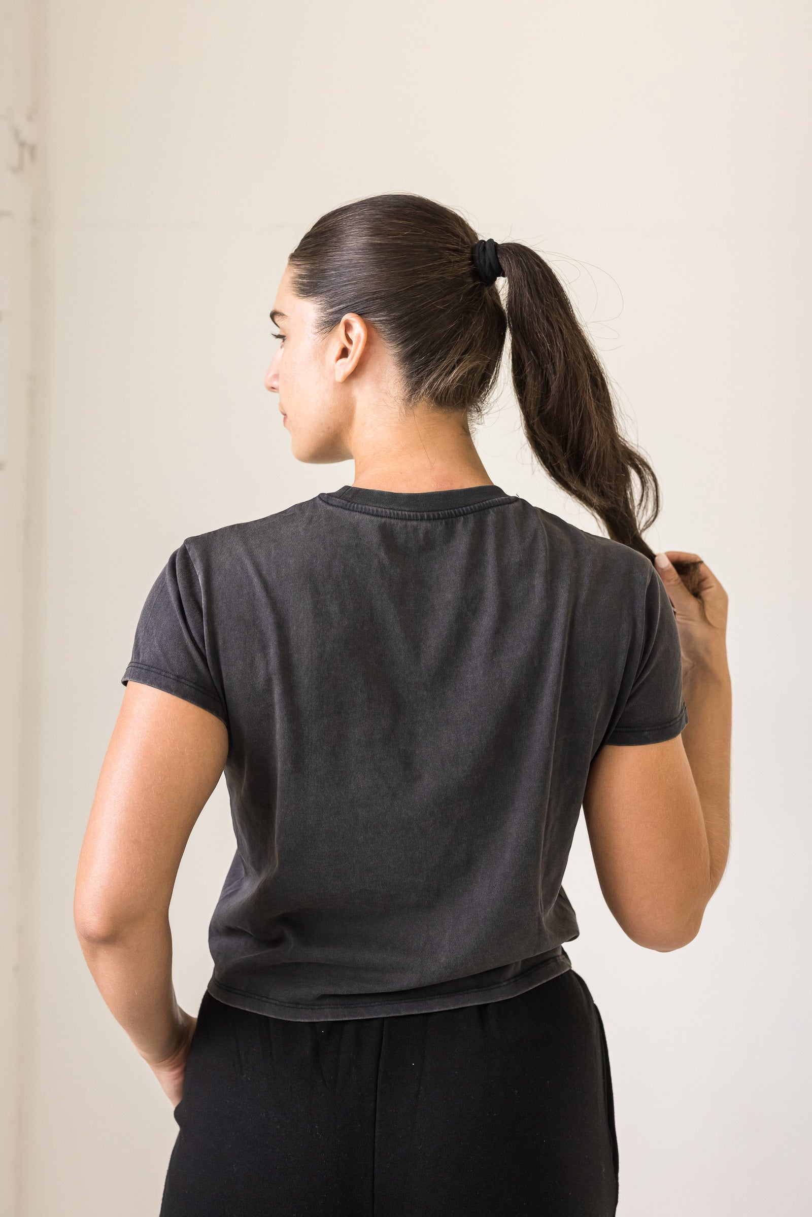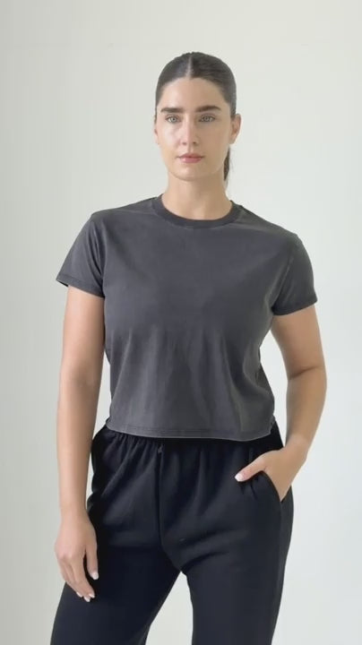 Get footloose and fancy-free in this semi-cropped tee! With a washed black finish, it's perfect for those casual days when you just want to be comfortable. Let loose and have some fun in this playful and quirky semi-crop tee.