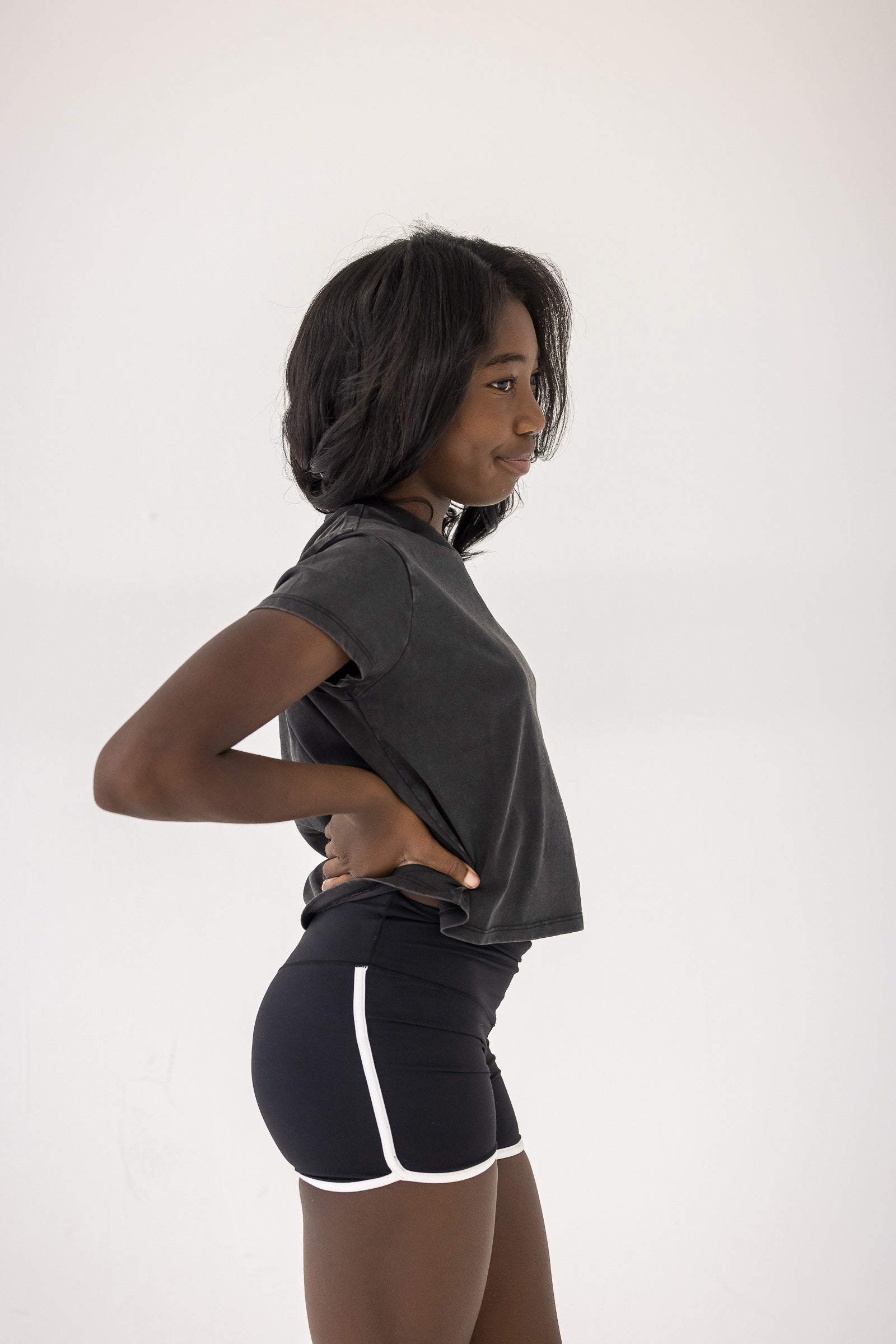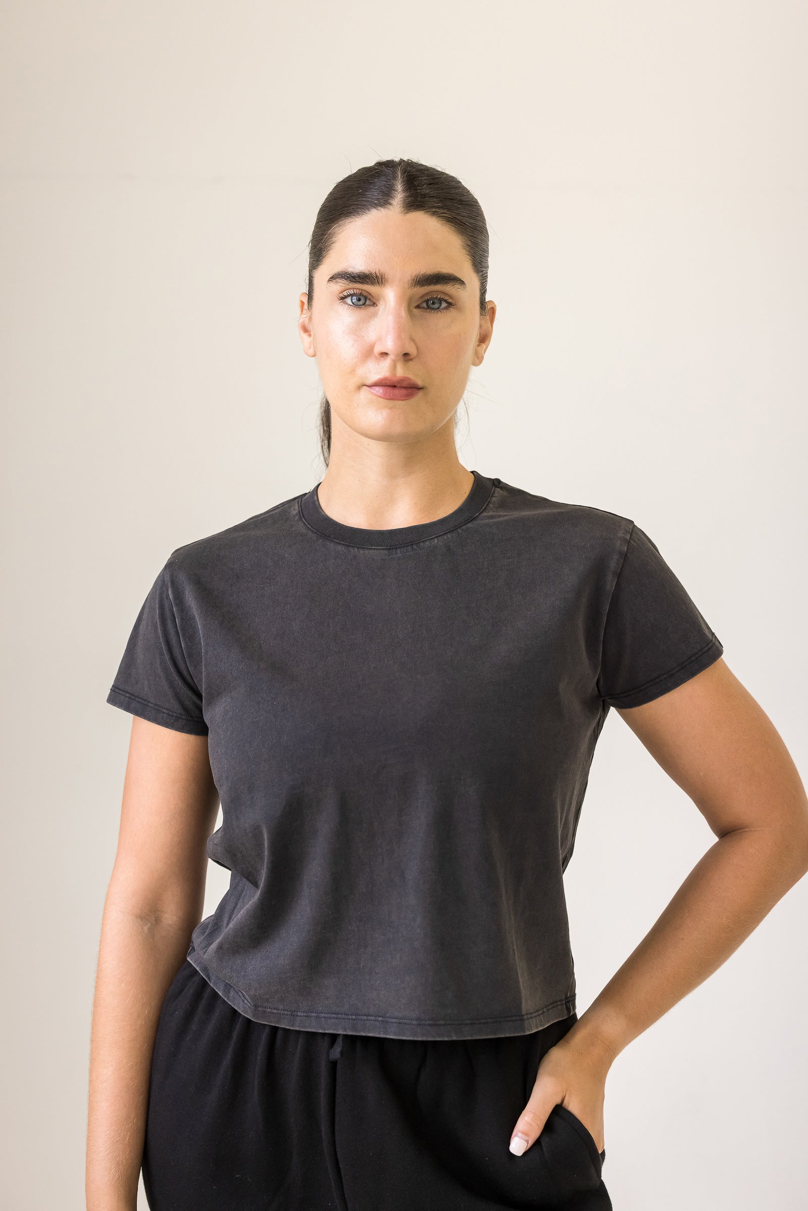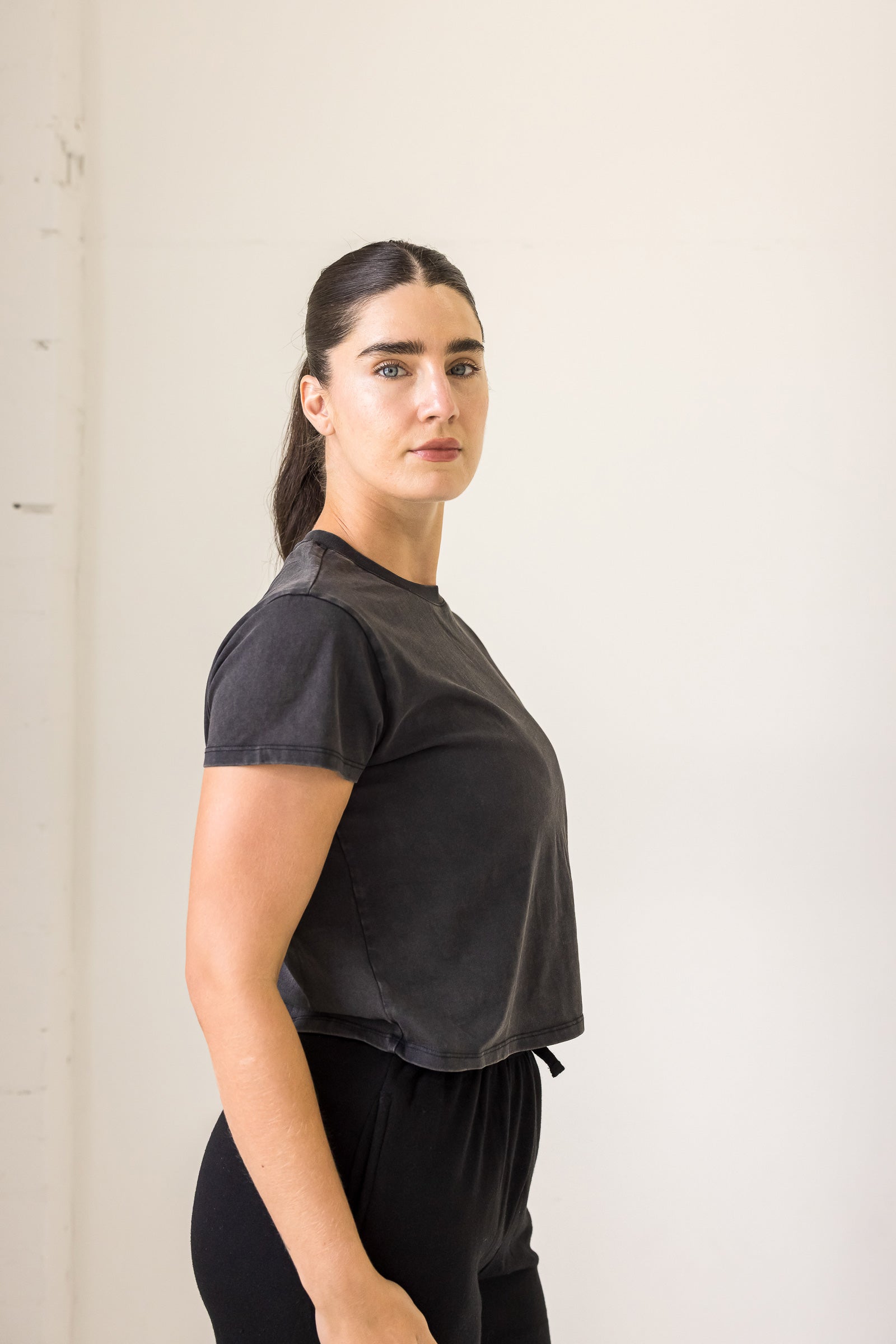 Get footloose and fancy-free in this semi-cropped tee! With a washed black finish, it's perfect for those casual days when you just want to be comfortable. Let loose and have some fun in this playful and quirky semi-crop tee.